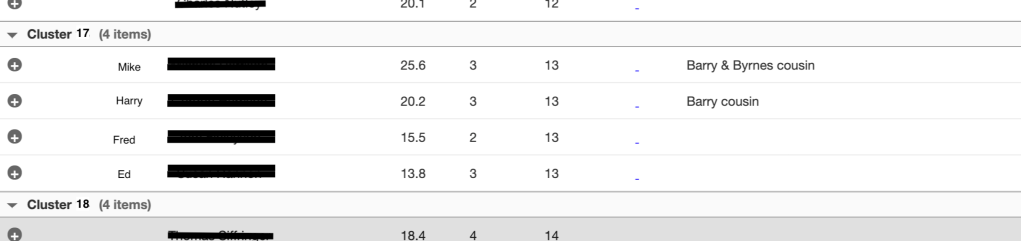 Looking at the cluster table below my AutoCluster I can see the notes that I added for my known cousins.  The cluster table is shown in Figure 9. I’ve chatted with Mike several times and know that he matches both my Dad’s mother’s and father’s sides of my family. Harry only matches on my Dad’s father’s side.