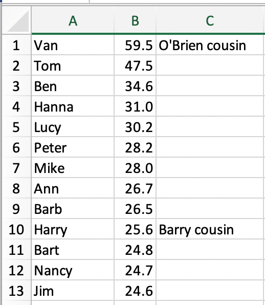 To run manual AutoCluster for LivingDNA, I started with my match list from LivingDNA, shown in figure 1. I had put the name2 in Column A and the cM values in Column B, as shown in figure 2, when I ran my Leeds analysis.
