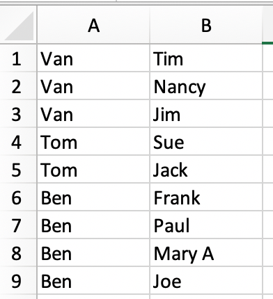 The Mac TextEdit preserved the formatting from LivingDNA, however when I copied the names into my spreadsheet and saved as a CSV file, all the formatting disappeared and the file only contained text.  If you are using Notepad on Windows the formatting disappears when you copy it into Notepad.  Figure 6 shows my spreadsheet with the match’s name in Column A and the shared matches in Column B.