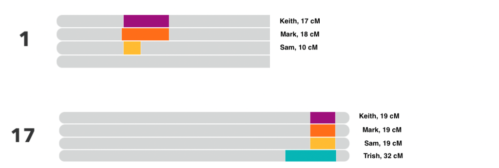 Next I will look at ICW AutoCluster 2 which compares to AutoSegment cluster 1. From the segment cluster details in figure 4, I can see that Mark and Keith match me on chr 1 as well as matching Trish and me along with Sam on chr 17. The ICW cluster tells me they all triangulate with Trish and me, and AutoSegment tells me they all share the same segment. After looking at the AutoSegment cluster 1 details I can see that the chr we all share is chr 17. Here I used the ‘Advanced DNA Comparison’ on 23andMe, shown in figure 6. Sam also matches me on chr 1 with 10 cM. I had used 15 cM as the minimum shared amount between matches when I ran the two clusters, which explains why he did not show up as a match on chr 1 in the AutoSegment cluster 1 details.