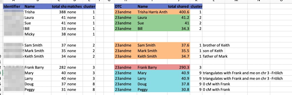 Next I moved to ICW cluster 3 which has my 2C Frank Barry. We share paternal great grandparents Edward Barry and Pauline Fröhlich. These were my Dad’s paternal grandparents. Going through the same process as before I found Frank in AutoSegment cluster 3 but the rest of the matches in ICW cluster 3 were in AutoSegment cluster 9 along with two new AutoSegment matches Doug and Peggy. I found Doug and Peggy in the ICW cluster 8.