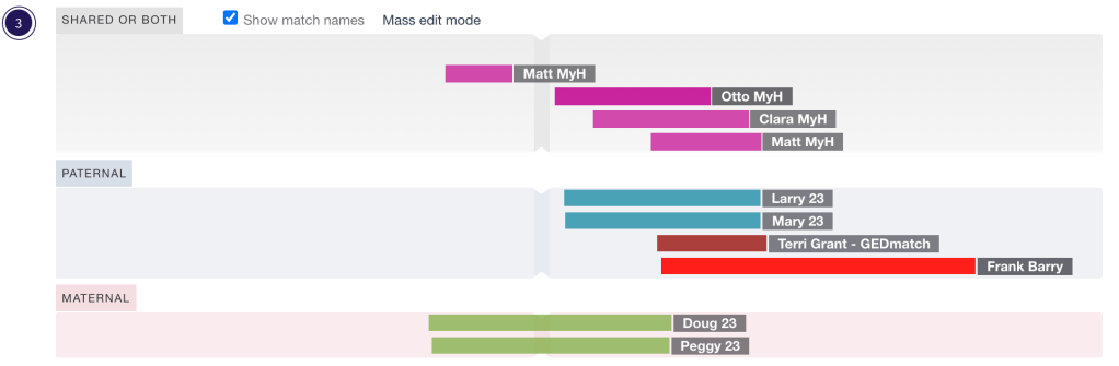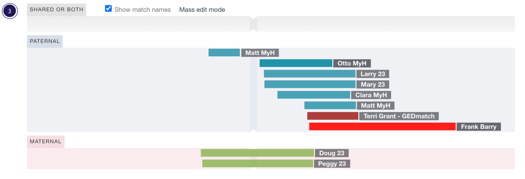 Looking further down Matt’s shared match list on MyHeritage I found that he triangulated with Terri Grant. Her name was very familiar and I was sure I’d painted her and others with that same surname. I found that I’d painted her as a triangulated match to Frank Barry, since they had matched on GEDmatch 1 to 1. Frank Barry is not on MyHeritage, so I’m unable to compare him directly with Matt. But since Terri is on both GEDmatch and MyH and she triangulates with both Frank and Matt, now I know that Matt and those that triangulate with him must be paternal. On DNA Painter I can merge Matt’s unknown group into the paternal group with Larry and Mary.