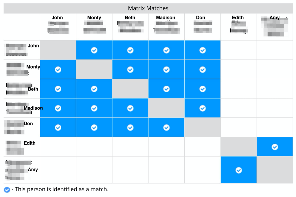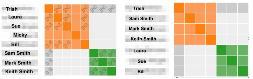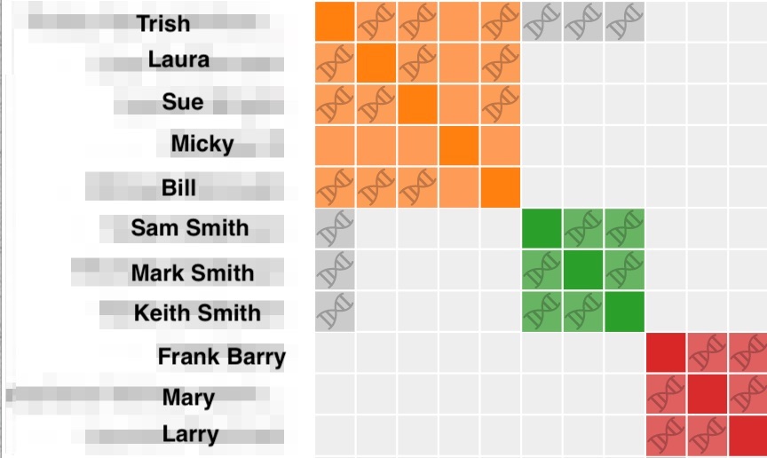 Each of the sites has different features and need to be treated a bit differently, so I will summarize them individually. On 23andMe an ICW cluster will have the helix symbols in the squares if the matches triangulate. That makes looking at the AutoSegment cluster very easy because knowing certain segments triangulate identifies them as being on the same side of your family. On MyHeritage, there was more mixing of clusters when I made the comparison between ICW and AutoSegment. It was necessary to check the chromosome browser on MyH to make sure that matches triangulated since looking at either of the clusters did not provide enough information to determine that. This step had not been necessary on 23andMe because of the triangulation symbols in the ICW cluster. FTDNA also required checking matches on their website. For FTDNA looking at matches in the matrix was needed to determine if AutoSegment matches were on the same side of the family or not. The AutoSegment clusters from GEDmatch have already included the GEDmatch triangulated data, so they will all be on the same side of the family.
