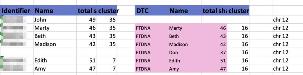 I looked at chr 12 on my DNA Painter profile and found that I had painted these matches as two different groups but both of them as unknown, as shown in figure 17. All of these matches are on the same location as AutoSegment has said. John wasn’t in the AutoSegment cluster and maybe there wasn’t enough overlap to his segment for him to be included, but he shows up on chr 12 with the others. Next, I looked at the matches in the FTDNA matrix which is shown in figure 18.