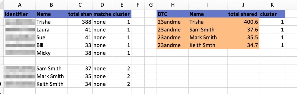 I mainly used Excel for my companion along with DNA Painter. DNA Painter is my main DNA match data storage location. I paint both known and unknown matches mainly looking at triangulated matches to group the data. Of course I was using 23andMe to check on matches that I’d not painted into DNA Painter. I started by opening the Excel files from both the ICW and the AutoSegment runs. In the ICW Excel file I copied columns A-E which included the match name (column B), the total cM (column C) and the cluster number (column E) and placed the copy into a new Excel file in columns A-E. Looking at ICW cluster 1 there were 5 matches listed with Trish as the first match. So I searched for Trish in AutoSegment file and copied the cluster that she was in there into columns H through K.
