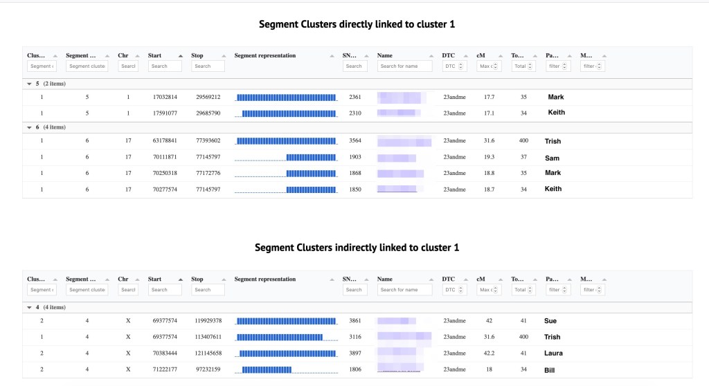 Below the AutoSegment cluster is a table of chromosome segment statistics. By clicking on the live link for cluster 1 I can see the list of matches in cluster 1 and which segments clusters or segments are underlying this AutoSegment cluster. Figure 4 shows the list for AutoSegment cluster 1. AutoSegment cluster 1, the orange cluster, shows Trish, Mark, Sam and Keith. The chromosome segments that are directly linked to this cluster 1 are listed in the chart. Mark and Keith match me on chr 1 and they and Sam also match Trish and me on chr 17. Also in this chart are the segment clusters that are indirectly linked to the the green cluster 1. These are from the green cluster 2 that are connected to Trish with the grey cells. They show Sue, Laura and Bill who triangulate with Trish and me on chr X.