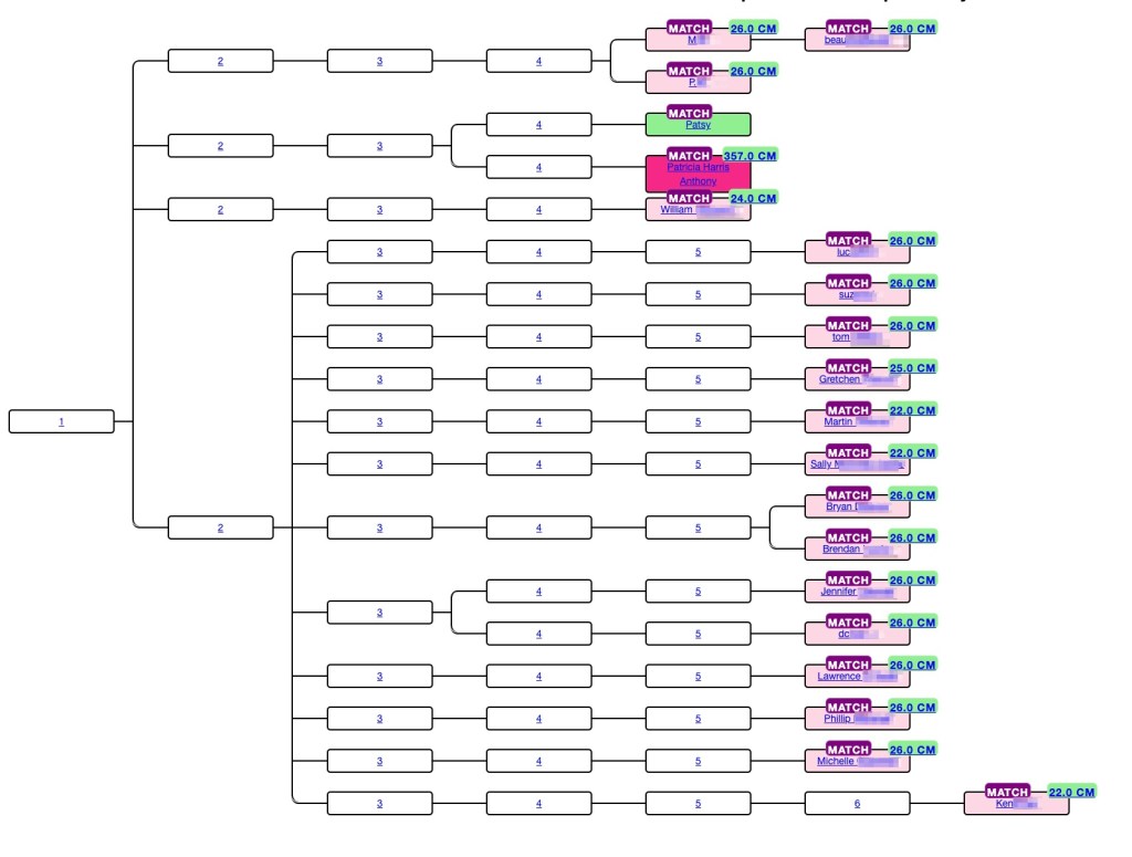 AutoKinship tree gives hints as to how matches can be related based on the amounts of shared DNA. At the top of the tree beau is listed as child of M, and M and P are listed as siblings. This is identical to what Ancestry said about these matches. But not every relationship is correct. Trish and I are second cousins, but we share a larger amount of DNA than would be expected compared to the average for second cousins, and we’re often miss assigned as first cousins or first cousins once removed. However, the AutoKinship tree can be used to get valuable hints for connections for the matches.