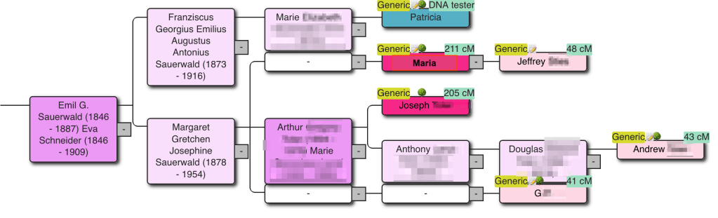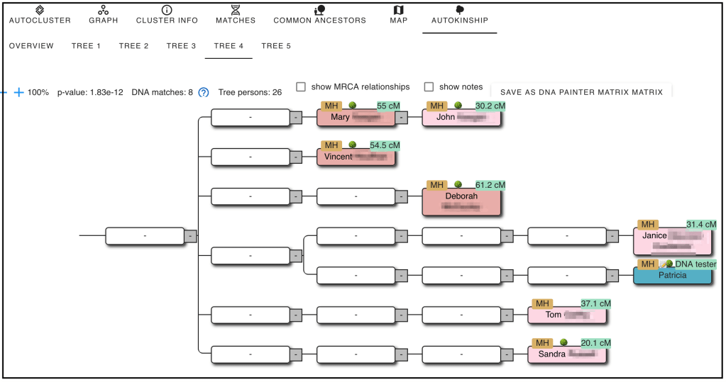 After starting AutoKinship for Cluster 37, you’ll see a resulting tree based on MRCA relationships. In this example, Christine was excluded from the output, but the rest of the cluster—including Jeffrey (Maria’s son)—was included, even though Jeffrey’s tree wasn’t available during the “Find Common Ancestors” step.