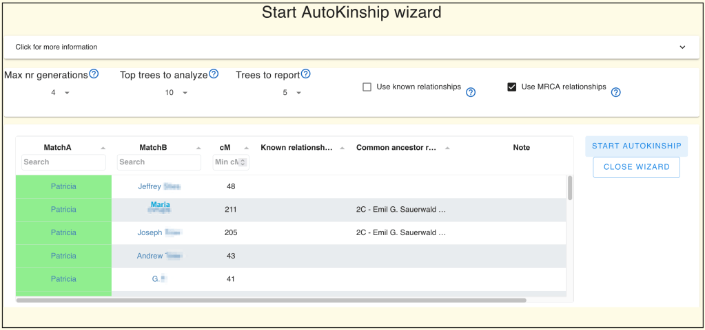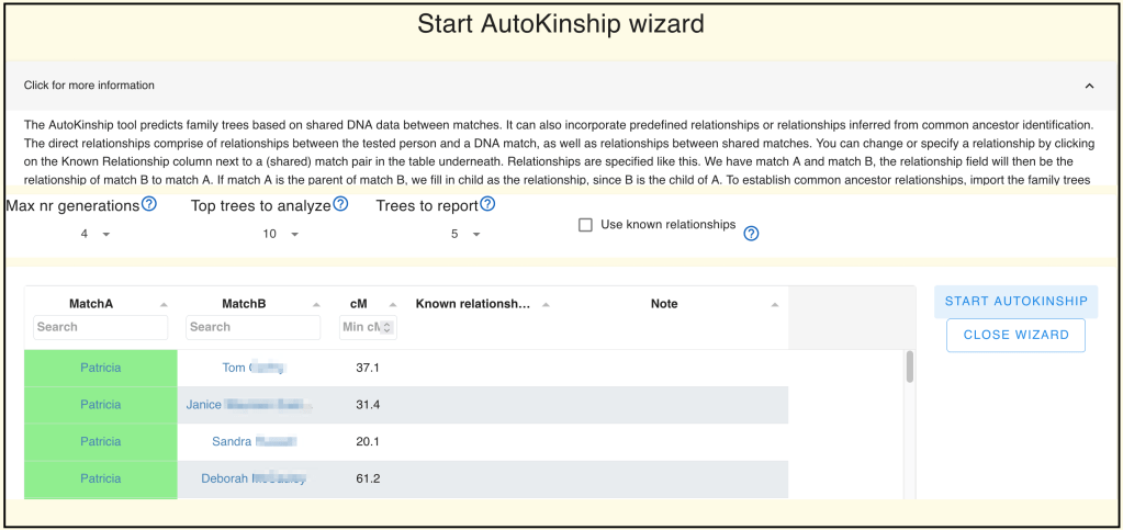 Clicking “Matches”once more brings up the match list and the “AutoKinship” button.