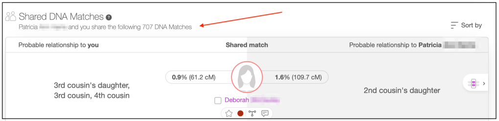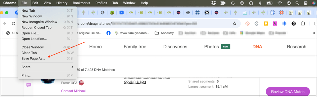 You can save as many pages of matches as you’d like for you analysis. The shared matches page often includes relationship hints like “Ancestral surnames” or “Shared ancestral places.” If a match has a tree, you can export it as a GEDCOM file using the Chrome plugin One2Tree.