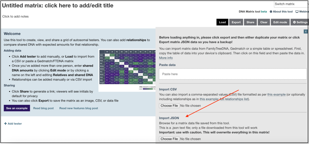 Select ‘Create a new matrix.’ A json file is one of the options under ‘Load.’
