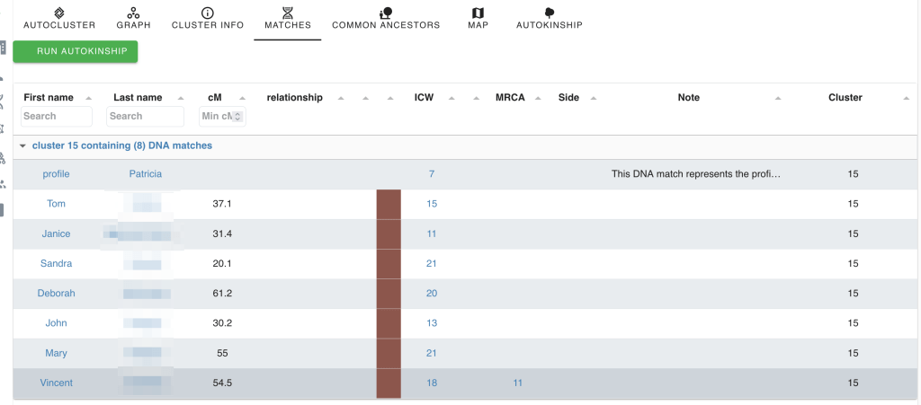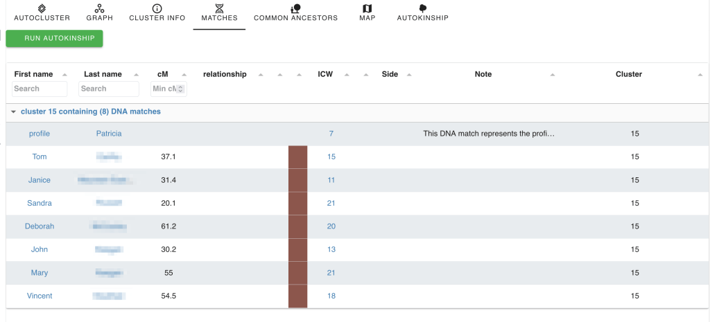Let’s look at Cluster 15, the brown cluster with seven matches. Clicking “Matches” and scrolling to Cluster 15 shows all individuals in that cluster, including the DNA tester.
