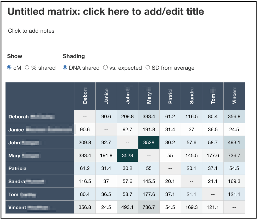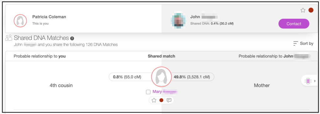 In our example, I don’t know my exact relationship to any of the matches, but I do know that Mary is John’s mother, as stated on MyHeritage.