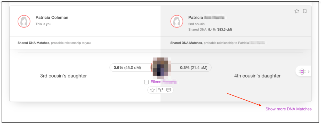 The page initially shows 10 matches. Click “Show more DNA matches” to load more in batches of 10 until you’ve collected as many as needed. I often will add shared matches until I reach a specific cM value.
