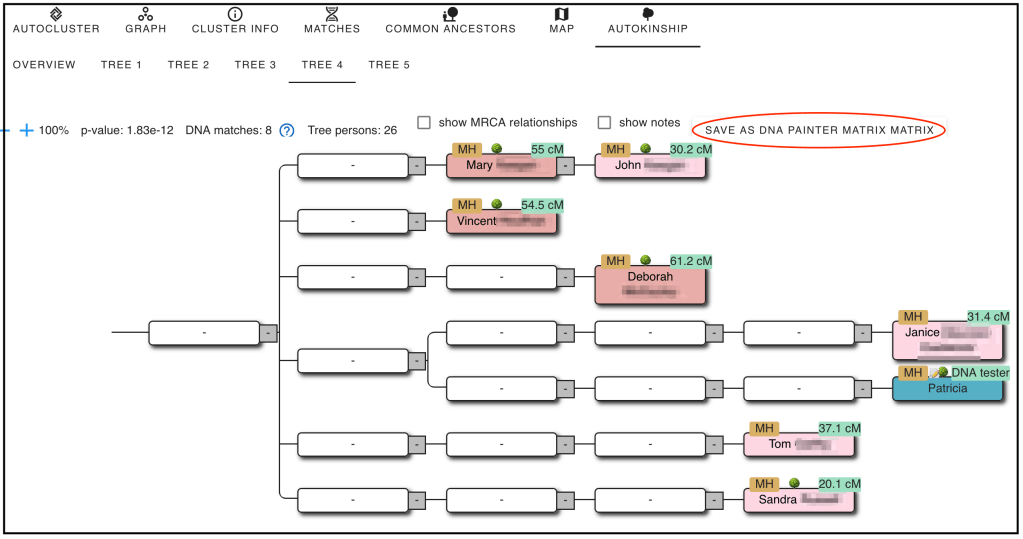 In the reconstructed tree you can see a number of the matches that are in cluster 37. Several matches that are on MyHeritage are also in the reconstructed tree. Now when we run the cluster with AutoKinship we can ‘Use MRCA relationships’ from the reconstructed tree to help in placing the people in the family.