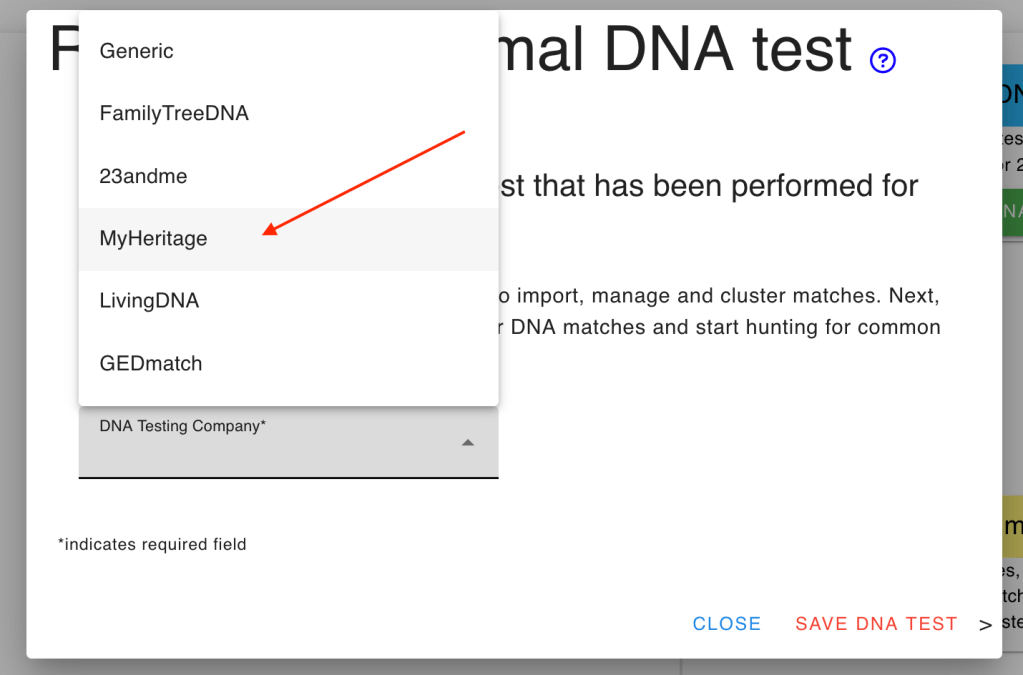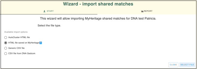 There are several options for importing MyHeritage matches. We have collected the HTML file, so that is the selection we need here. Once the matches are added, from the ‘DNA overview’ page select ‘Import shared matches.’