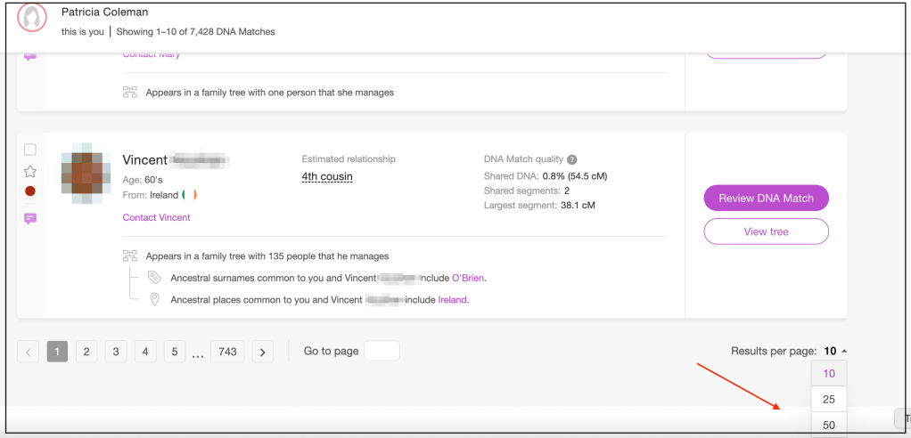 To get started we first set the MyHeritage matches page to display 50 matches per page. Scroll to the bottom of the DNA match page and the setting is on the lower right corner.